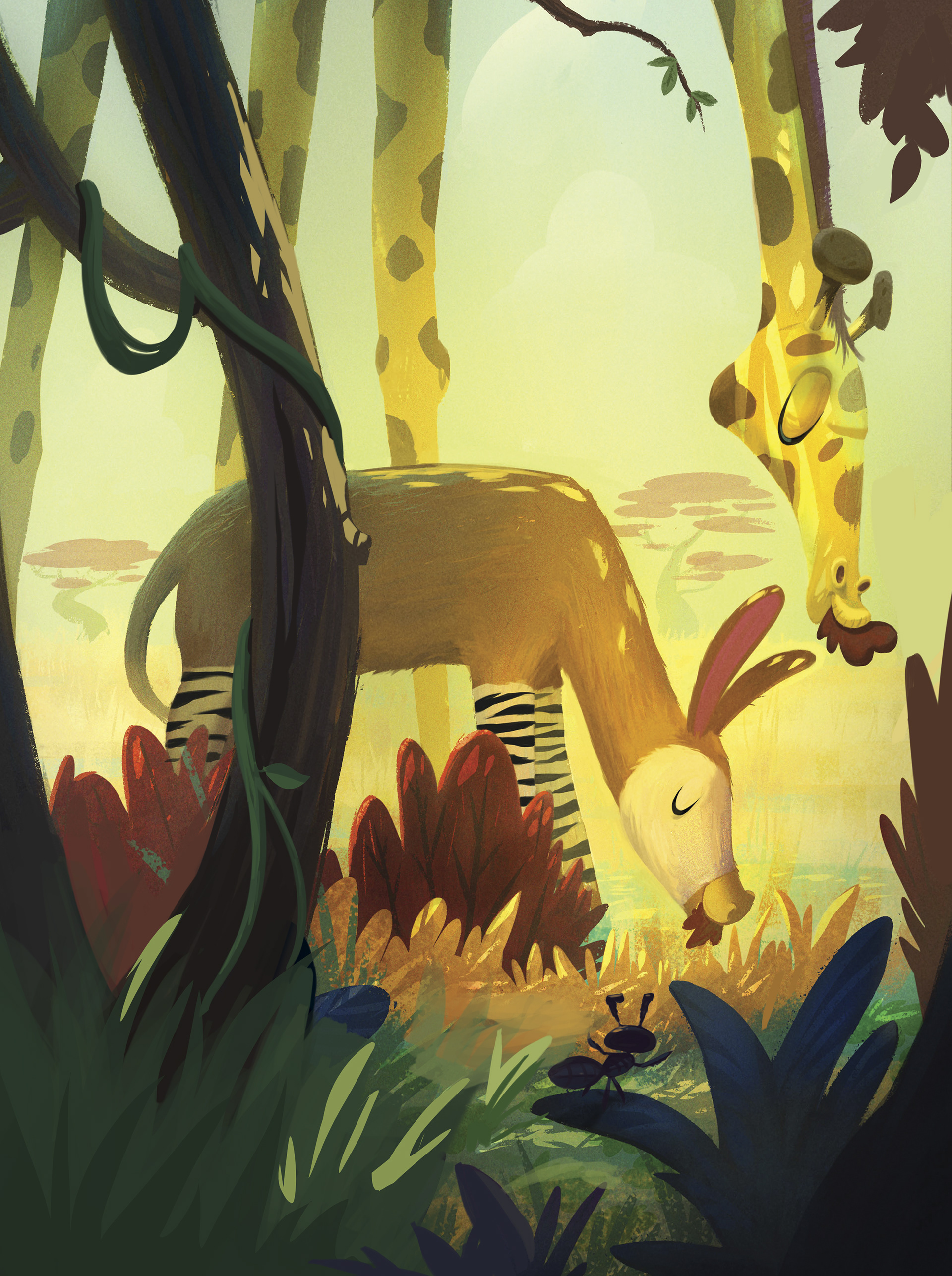 Illustrating the children's book Ocapi, by Adriana Bastos, was a very special experience. The story follows the adventures of Ocapi, a curious and playful creature — half zebra, half horse, but 100% adventurous — as she explores the world and learns important lessons while meeting several exotic animals she had never encountered before.